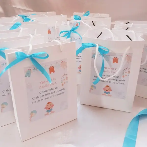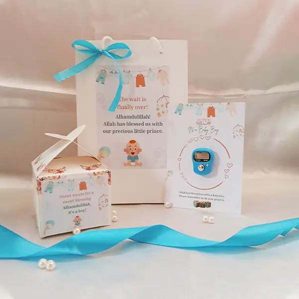 This birth announcement hamper includes a Tasbeeh counter, a customized announcement card, and an empty mithai box—ready to be filled with your favorite sweets. It’s a beautiful blend of tradition, love, and celebration, making it the perfect gift for family and friends on this special occasion.