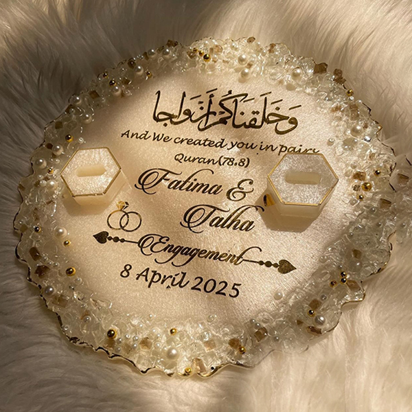 Celebrate your special moments with elegance and charm through our Resin Engagement Tray — a stunning masterpiece handcrafted with care and creativity. Designed using high-quality resin and embellished with delicate details, this tray adds a luxurious touch to your engagement or wedding ceremony.